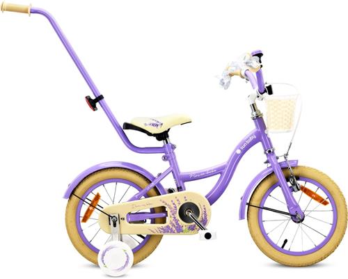 Flower Bike Fiets voor een meisje van 3 tot 5 jaar, 14 inch Lavendel, met fietsbel, zijwieltjes, duwstang en stuurmandje