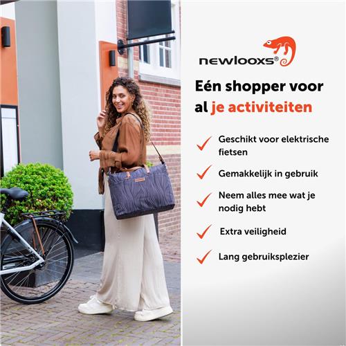 Dankzij de innovatieve New Looxs kunststof haken bevestig je de tas eenvoudig aan vrijwel elke fiets, inclusief elektrische fietsen. De afneembare schouderband maakt het mogelijk om de tas ook als handtas of schoudertas te gebruiken. Bovendien kun je de haken netjes verbergen in een ritsvakje wanneer je de tas niet op de fiets draagt.