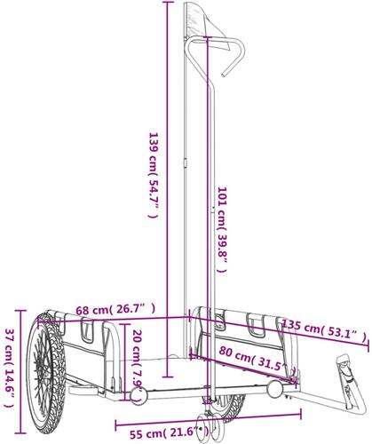Met doordachte ontwerpdetails, zoals de trekhaak, koppelt deze fietskar eenvoudig aan vrijwel elke fiets. Daarnaast is de veiligheidsvlag inbegrepen voor extra zichtbaarheid in het verkeer, zodat je veilig onderweg bent. De totale afmetingen van de trailer zijn 135 x 68 x 37 cm, terwijl de laadruimte met afmetingen van 80 x 55 x 20 cm voldoende ruimte biedt voor al je benodigdheden.